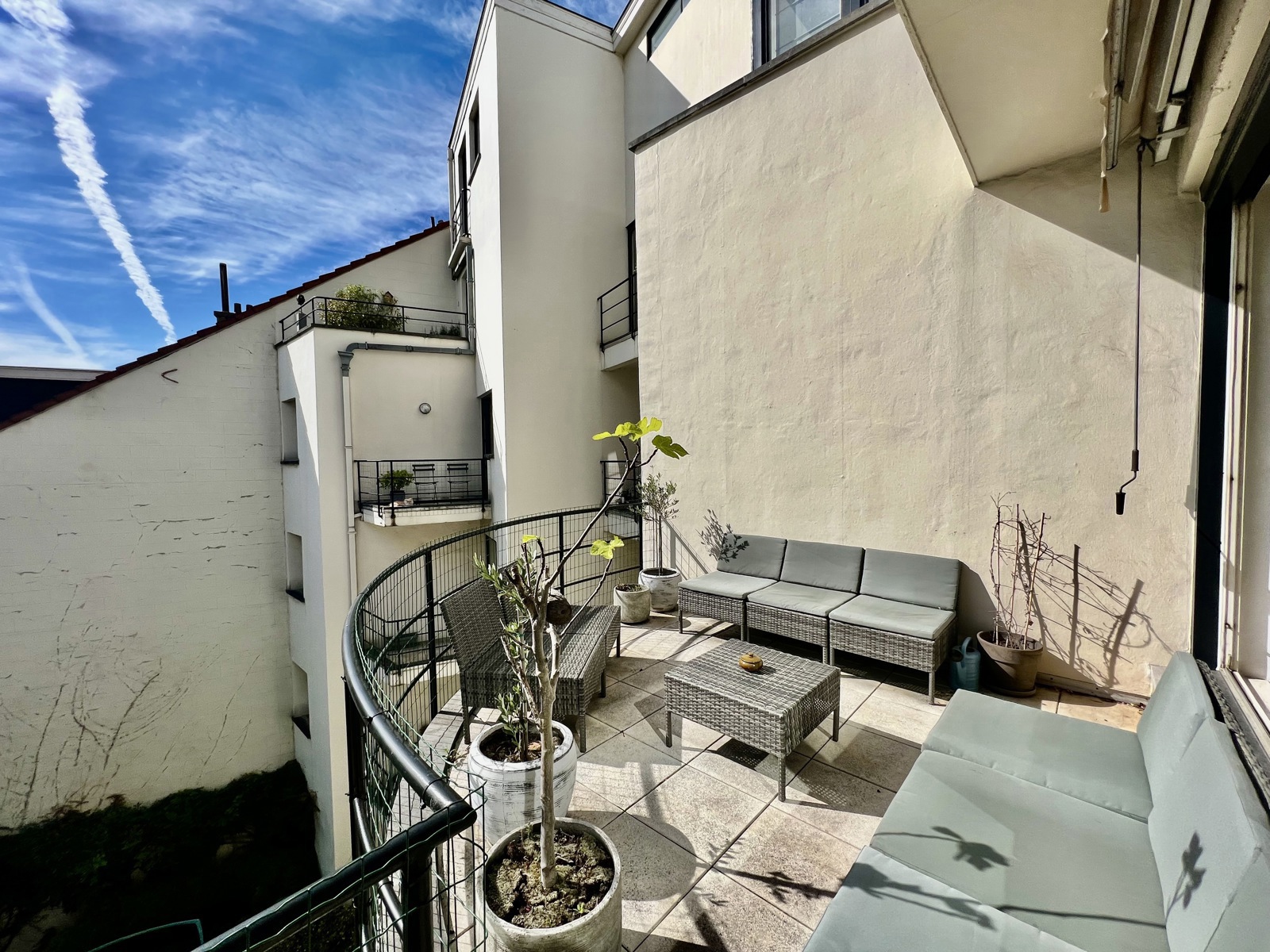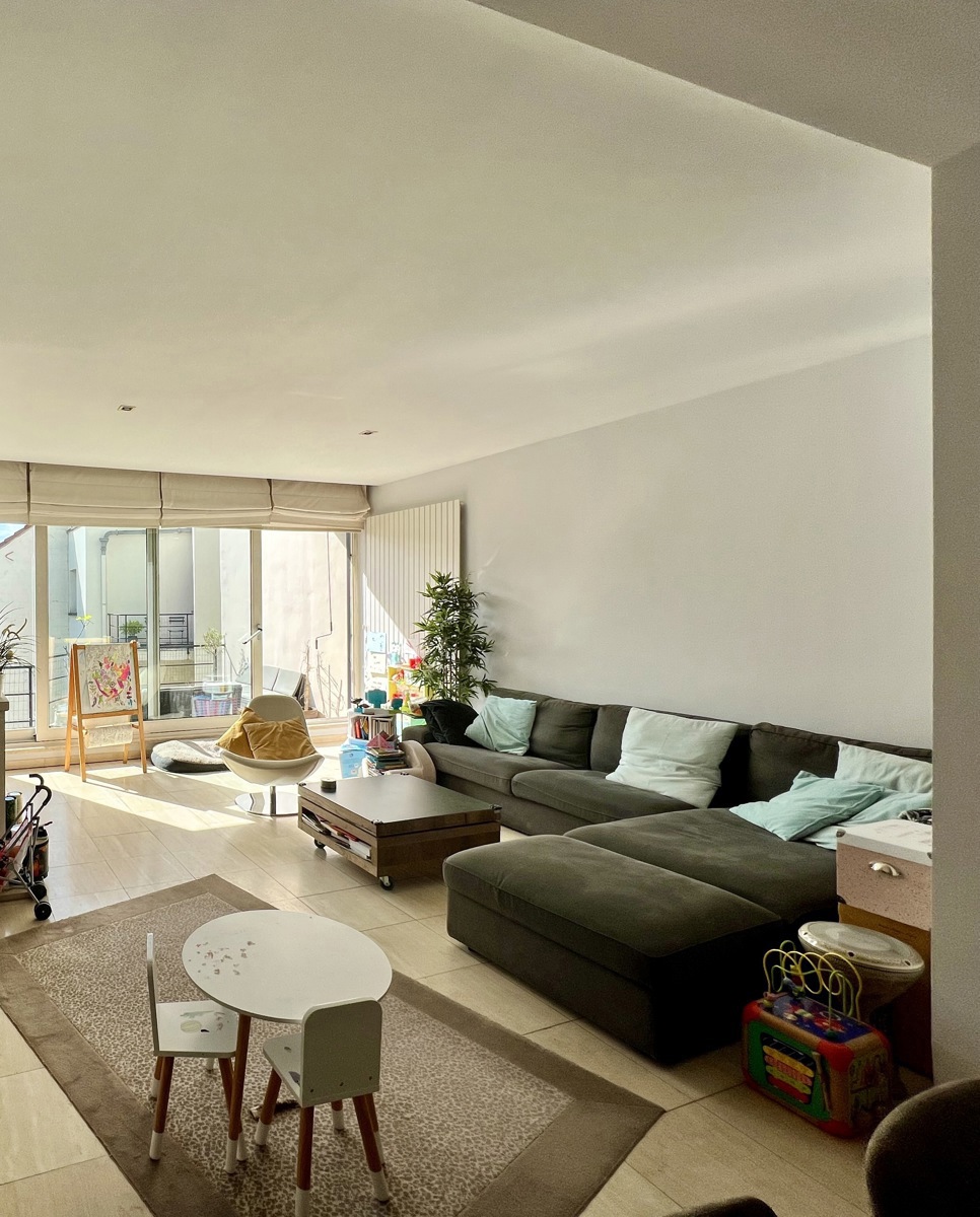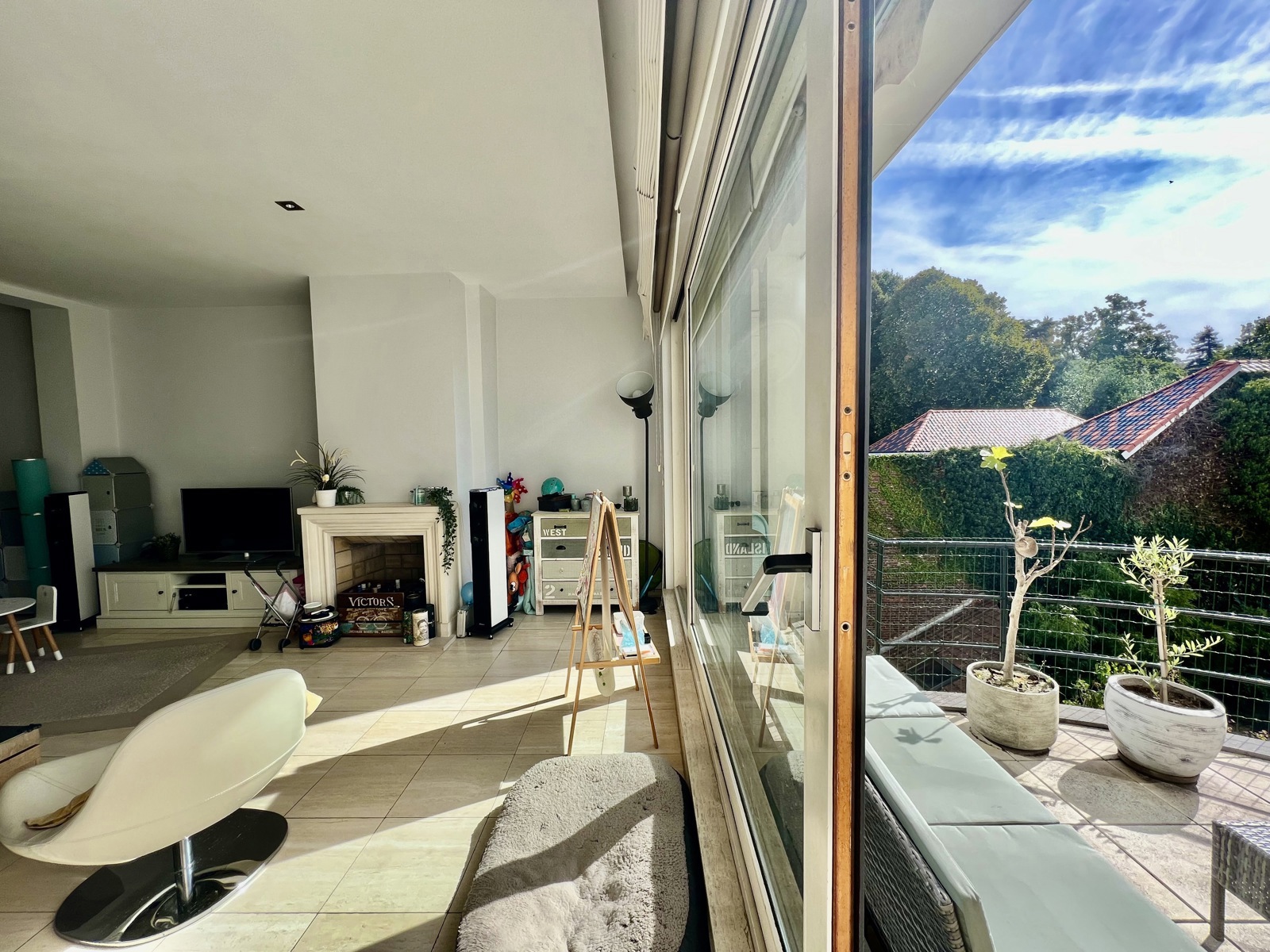 Grande et lumineuse pièce de vie de 41m2 avec feu ouvert donnant sur une jolie terrasse de 10m2 orientée sud-ouest.