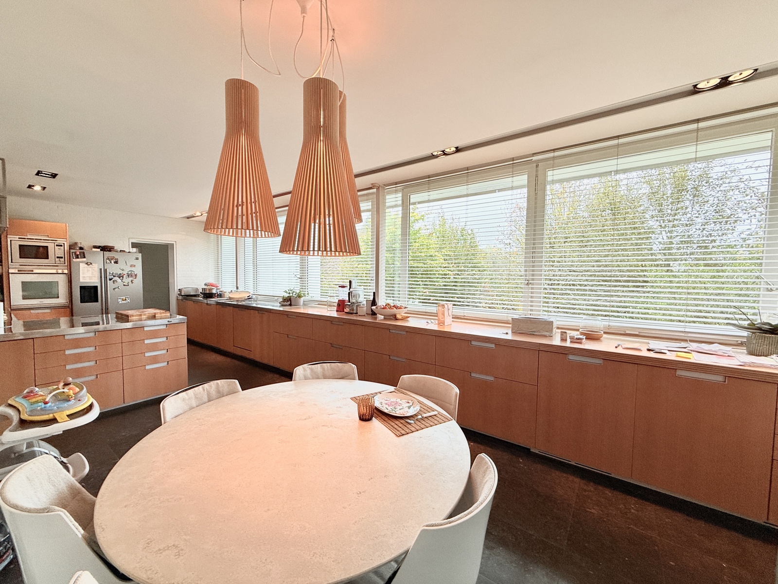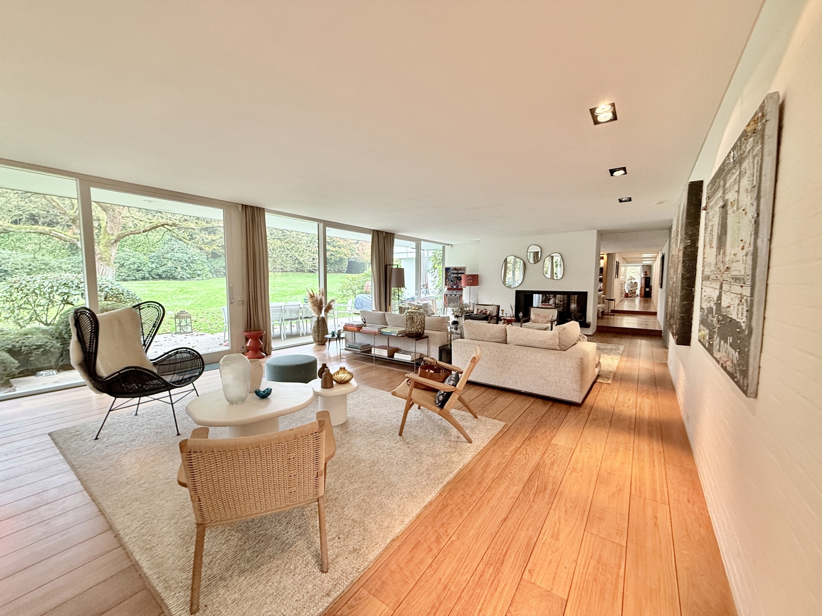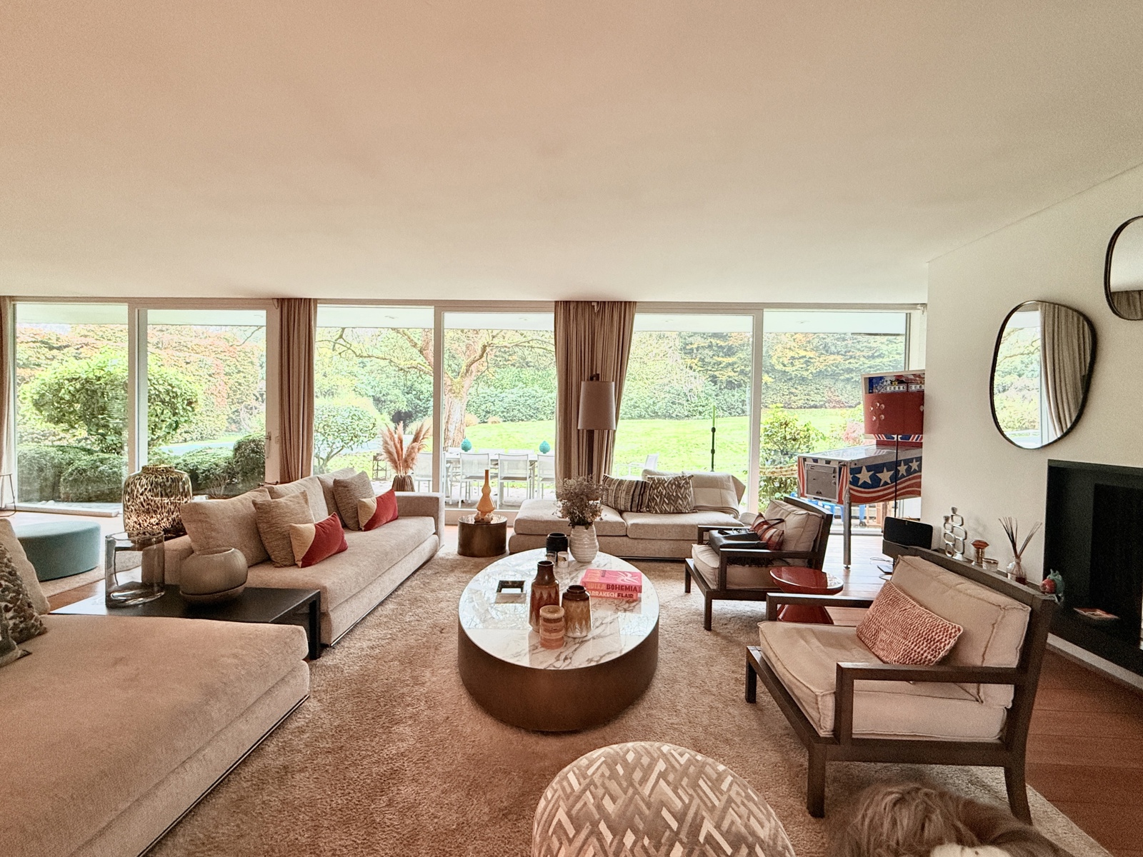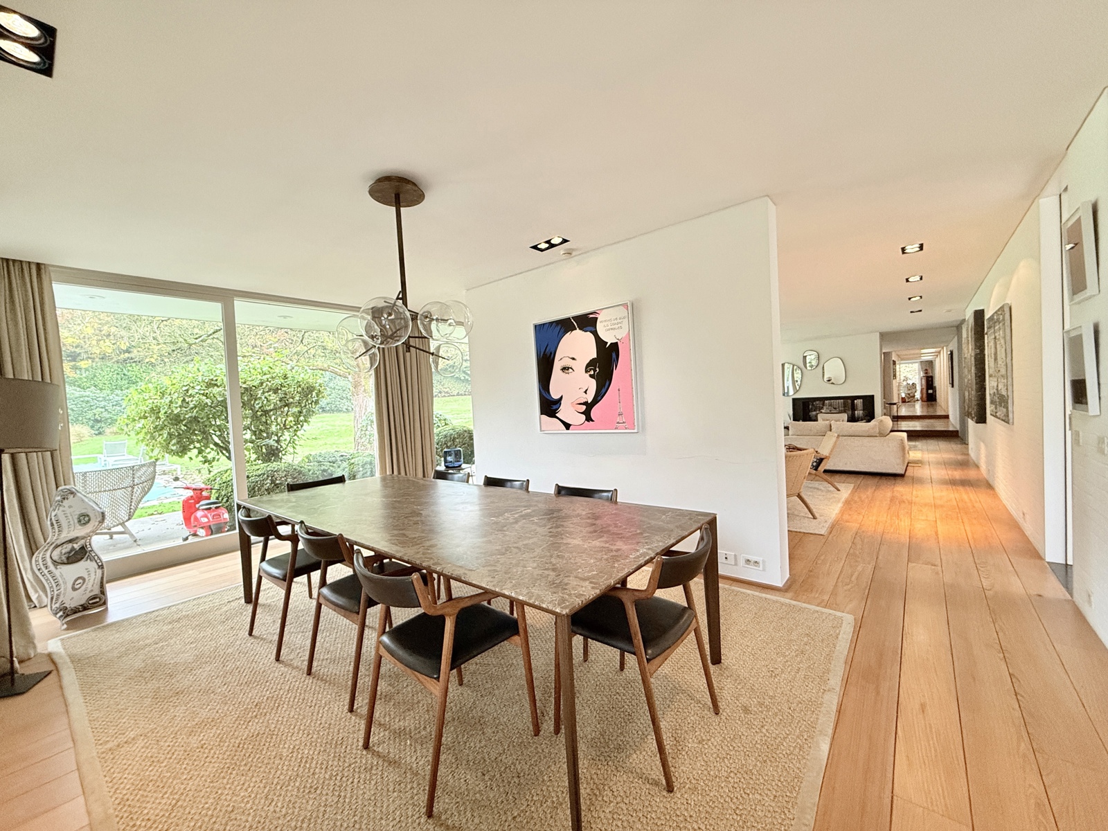 La villa se compose d'un rez-de-jardin avec un hall d'entrée, comprenant vestiaire et toilettes pour invités. De vastes espaces de réception +/- 125m² s'ouvrent sur l'extérieur, incluant un double salon avec feu ouvert et une salle à manger. La cuisine Gaggenau, super équipée, est aménagée avec un îlot central et un coin déjeuner.