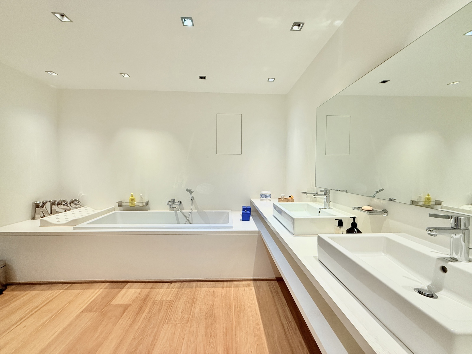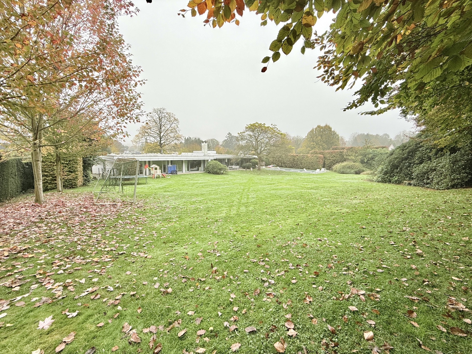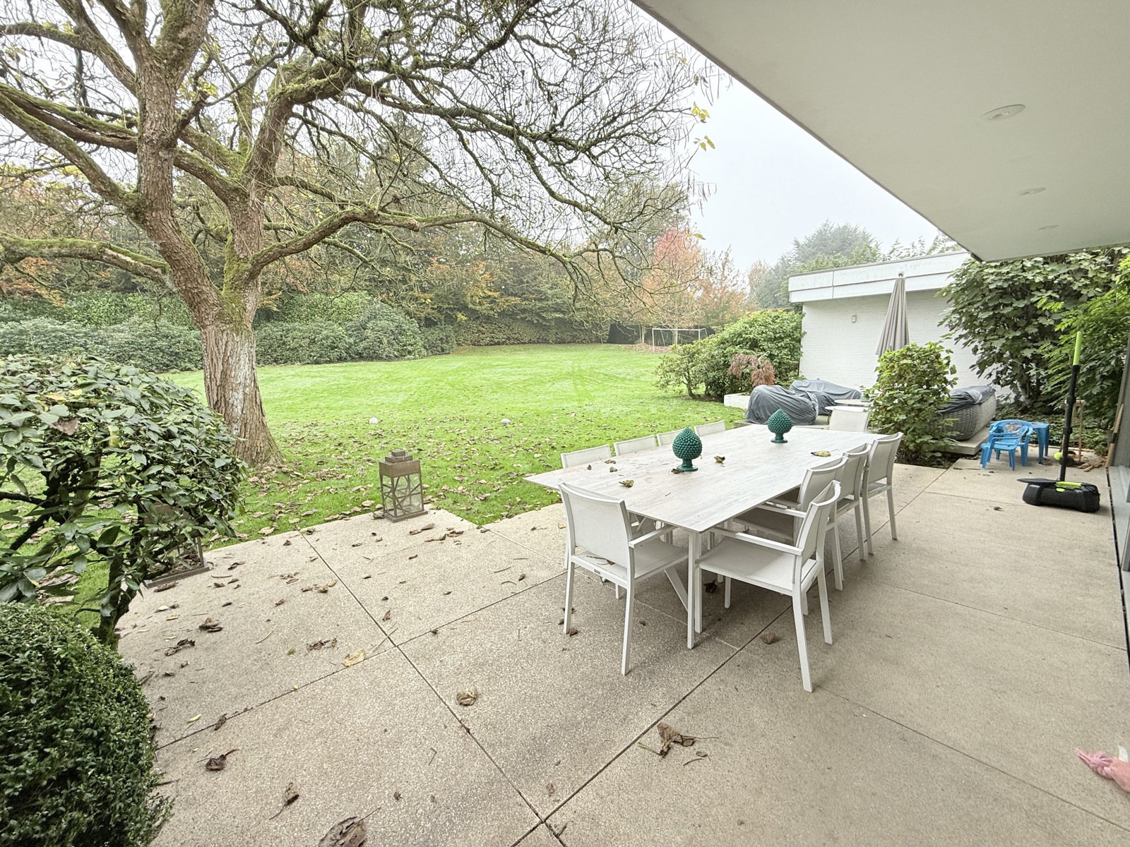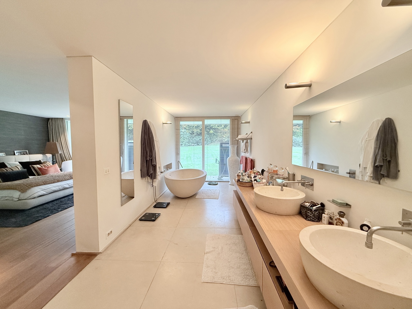 La villa se compose d'un rez-de-jardin avec un hall d'entrée, comprenant vestiaire et toilettes pour invités. De vastes espaces de réception +/- 125m² s'ouvrent sur l'extérieur, incluant un double salon avec feu ouvert et une salle à manger. La cuisine Gaggenau, super équipée, est aménagée avec un îlot central et un coin déjeuner.