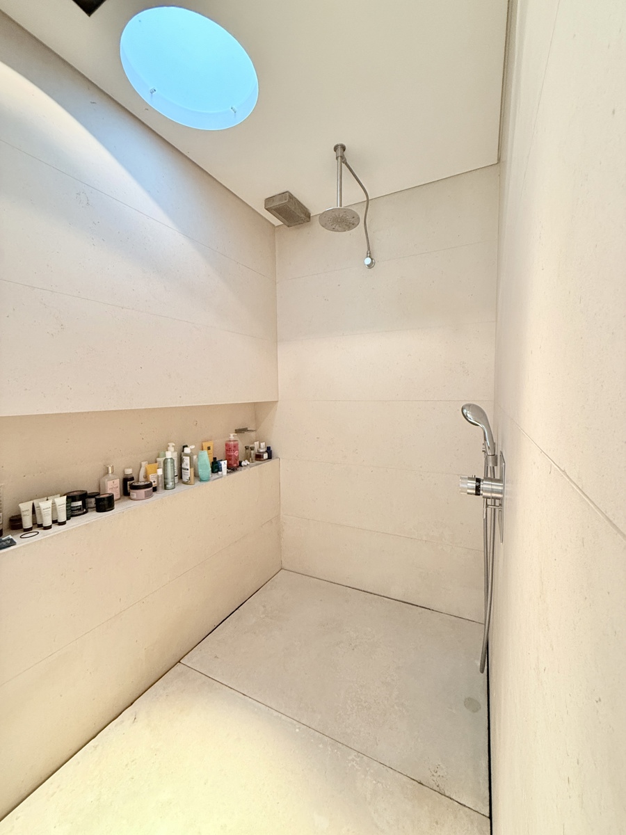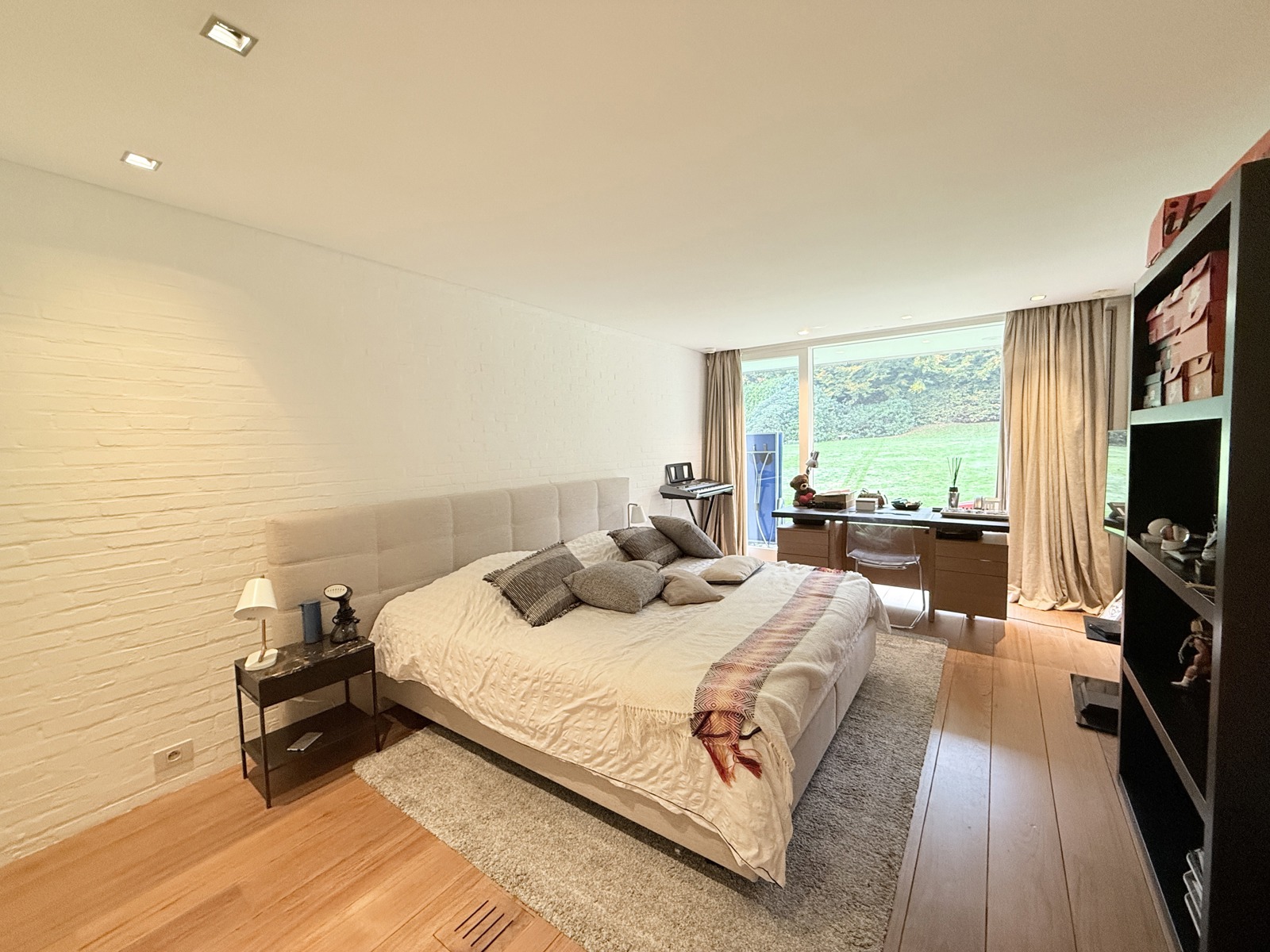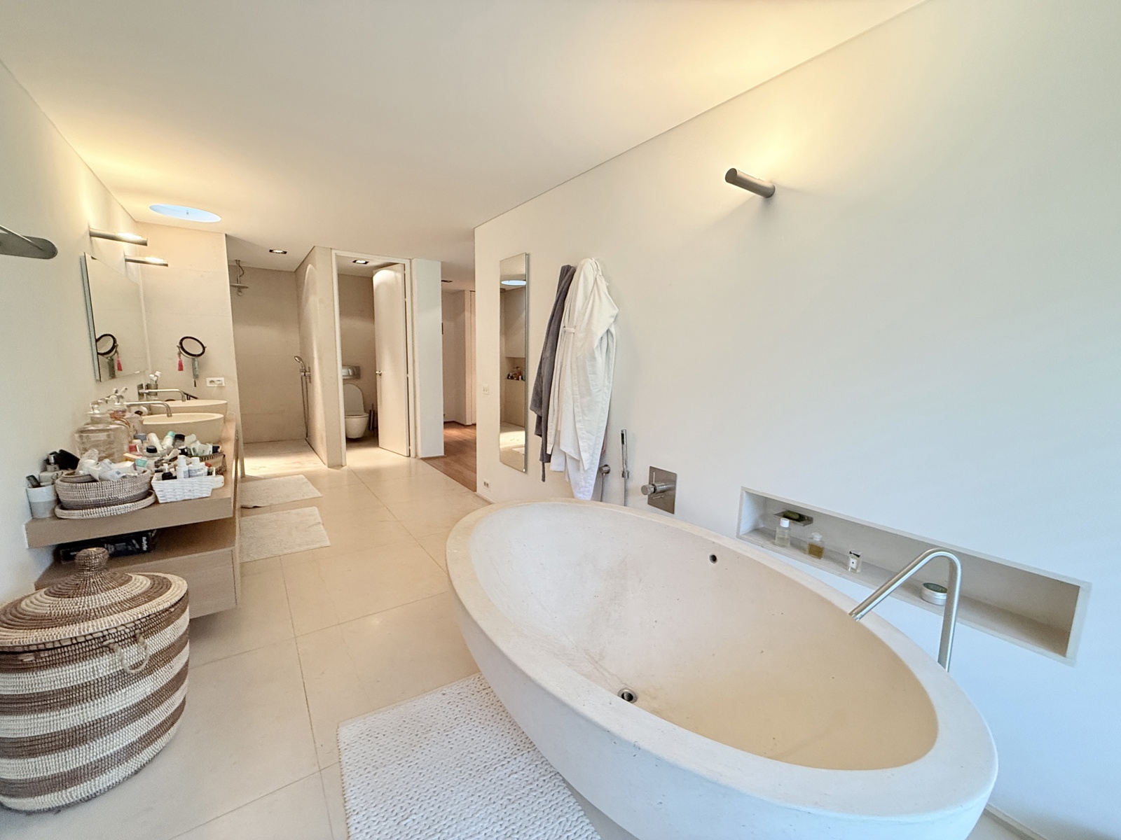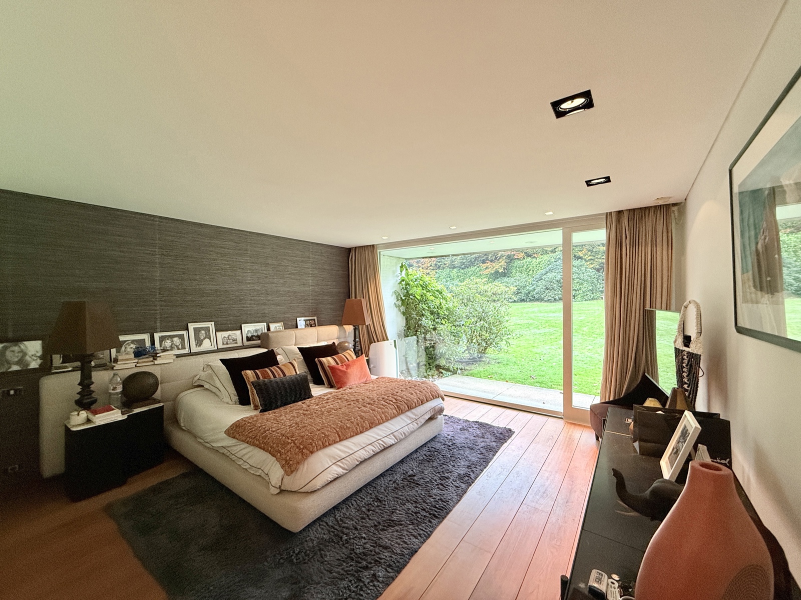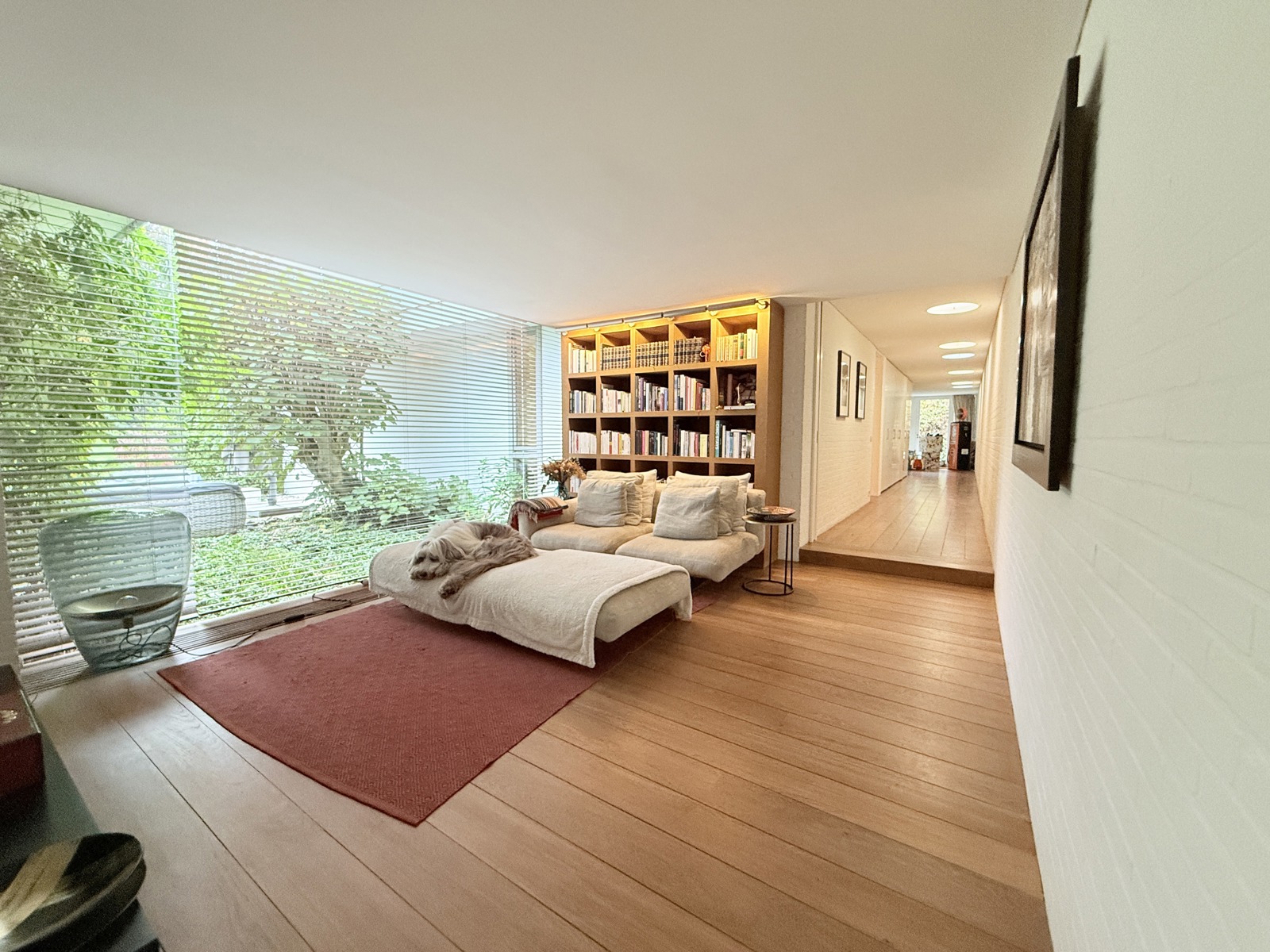 La villa se compose d'un rez-de-jardin avec un hall d'entrée, comprenant vestiaire et toilettes pour invités. De vastes espaces de réception +/- 125m² s'ouvrent sur l'extérieur, incluant un double salon avec feu ouvert et une salle à manger. La cuisine Gaggenau, super équipée, est aménagée avec un îlot central et un coin déjeuner.