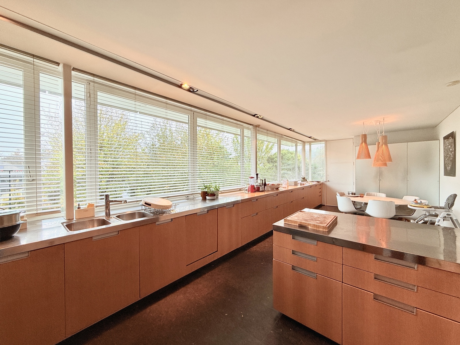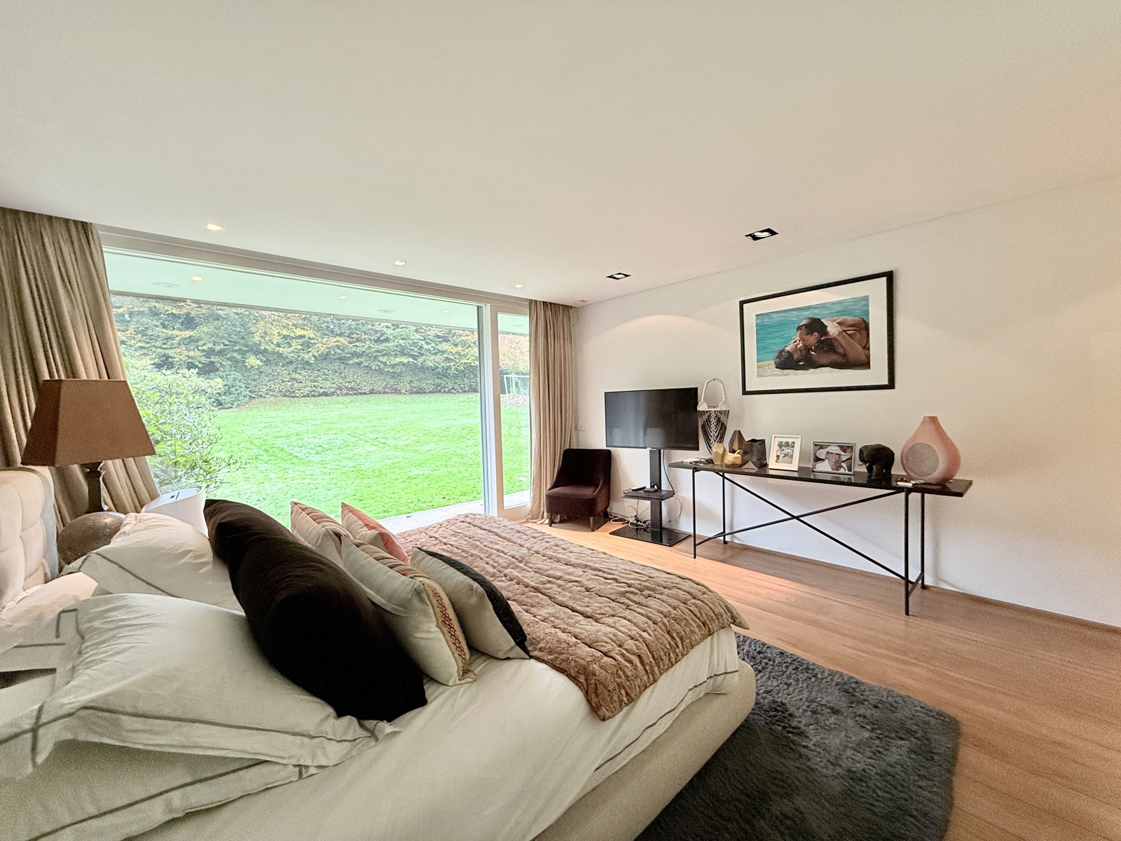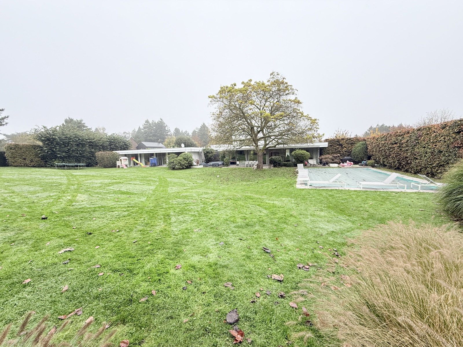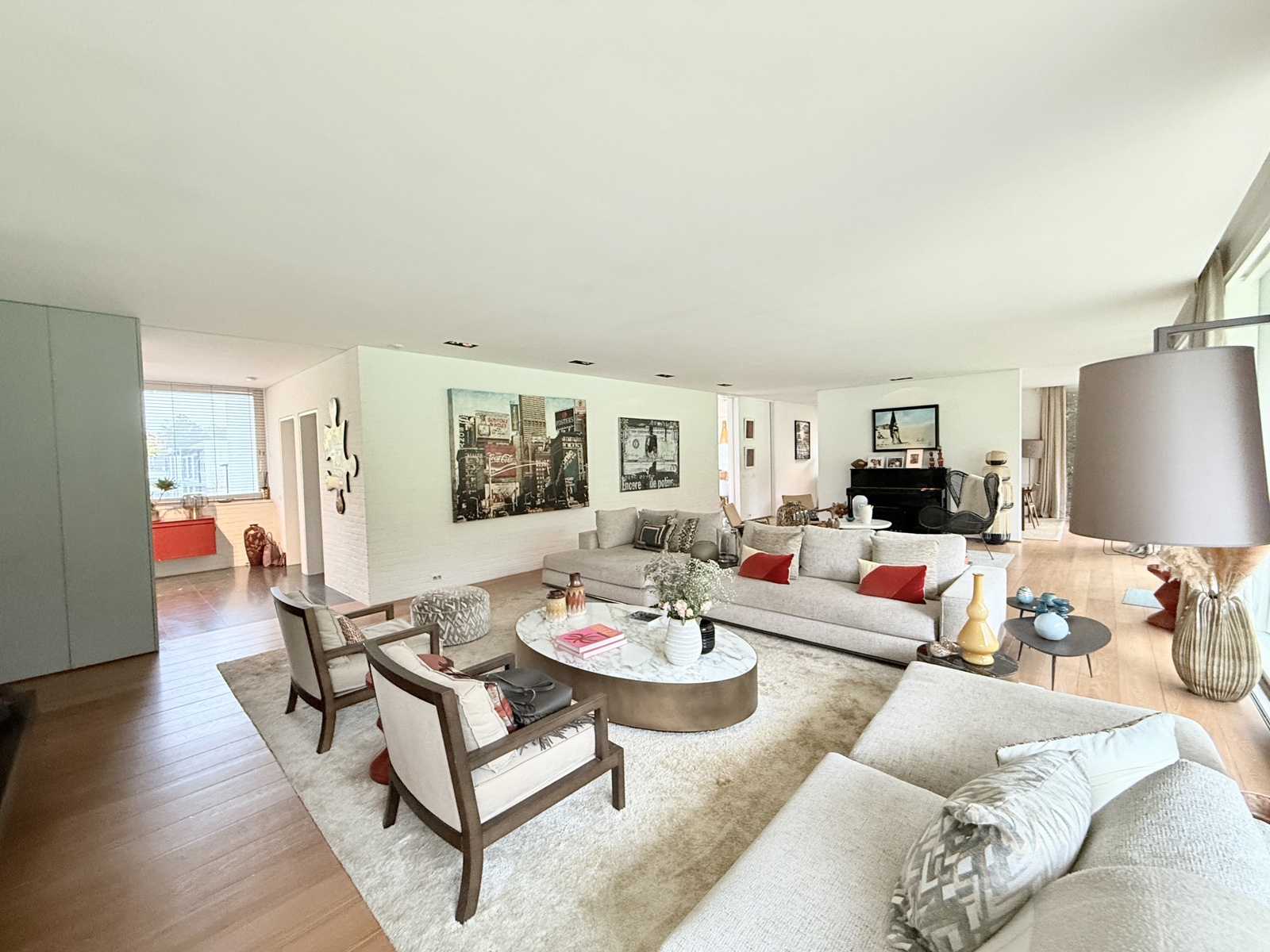 La villa se compose d'un rez-de-jardin avec un hall d'entrée, comprenant vestiaire et toilettes pour invités. De vastes espaces de réception +/- 125m² s'ouvrent sur l'extérieur, incluant un double salon avec feu ouvert et une salle à manger. La cuisine Gaggenau, super équipée, est aménagée avec un îlot central et un coin déjeuner.