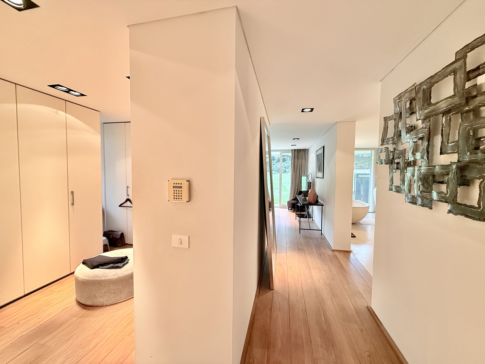 Toujours au rez-de-jardin, le hall de nuit dessert une suite parentale +/- 63m² avec dressing et salle de bains complète , ainsi que deux chambres supplémentaires, chacune dotée de placards et de leur propre salle de douche privative.
