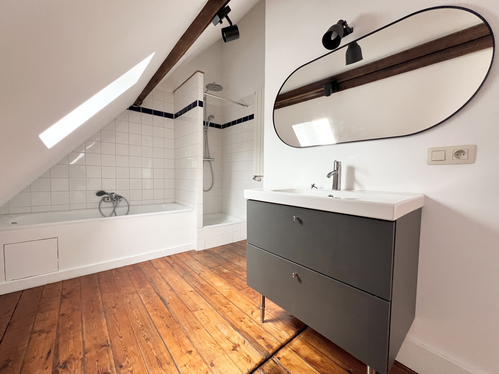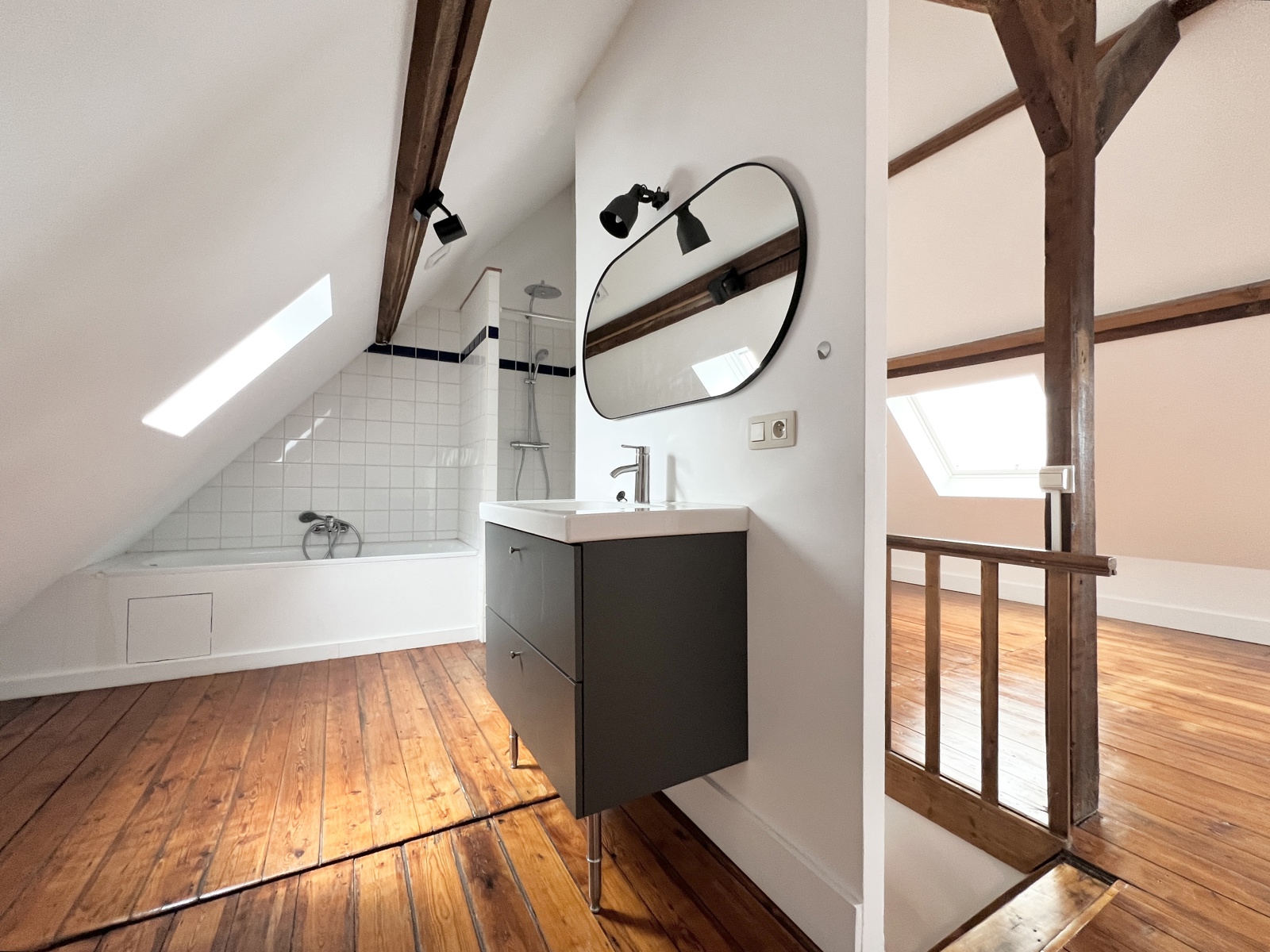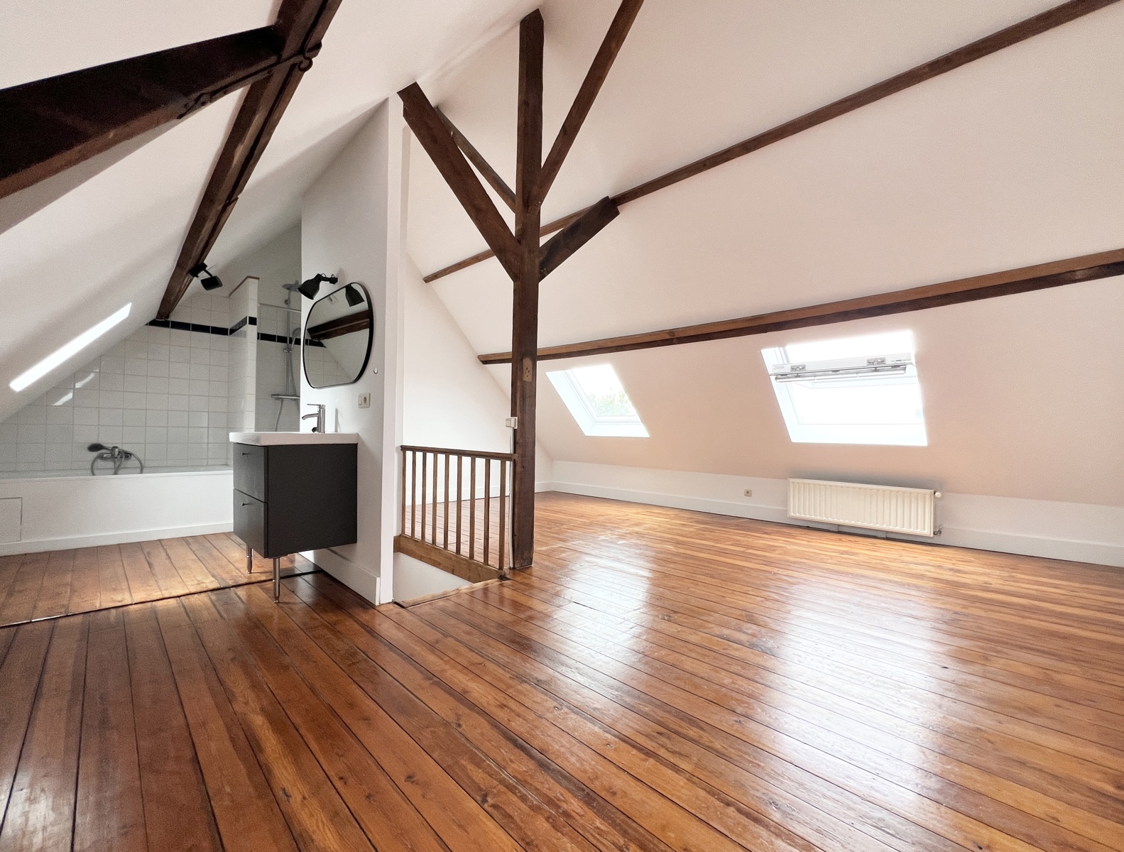 La partie nuit dessert, une grande chambre de +/- 26m² et une salle de bains avec douche et bains.