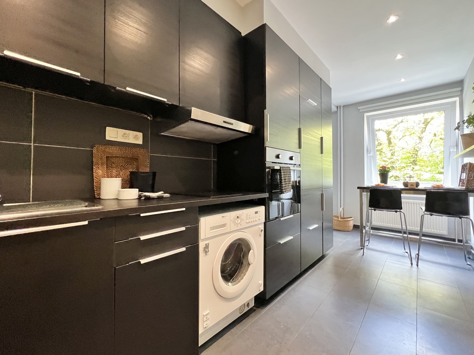 Une cuisine équipée avec coin déjeuner et emplacement pour machine à laver.