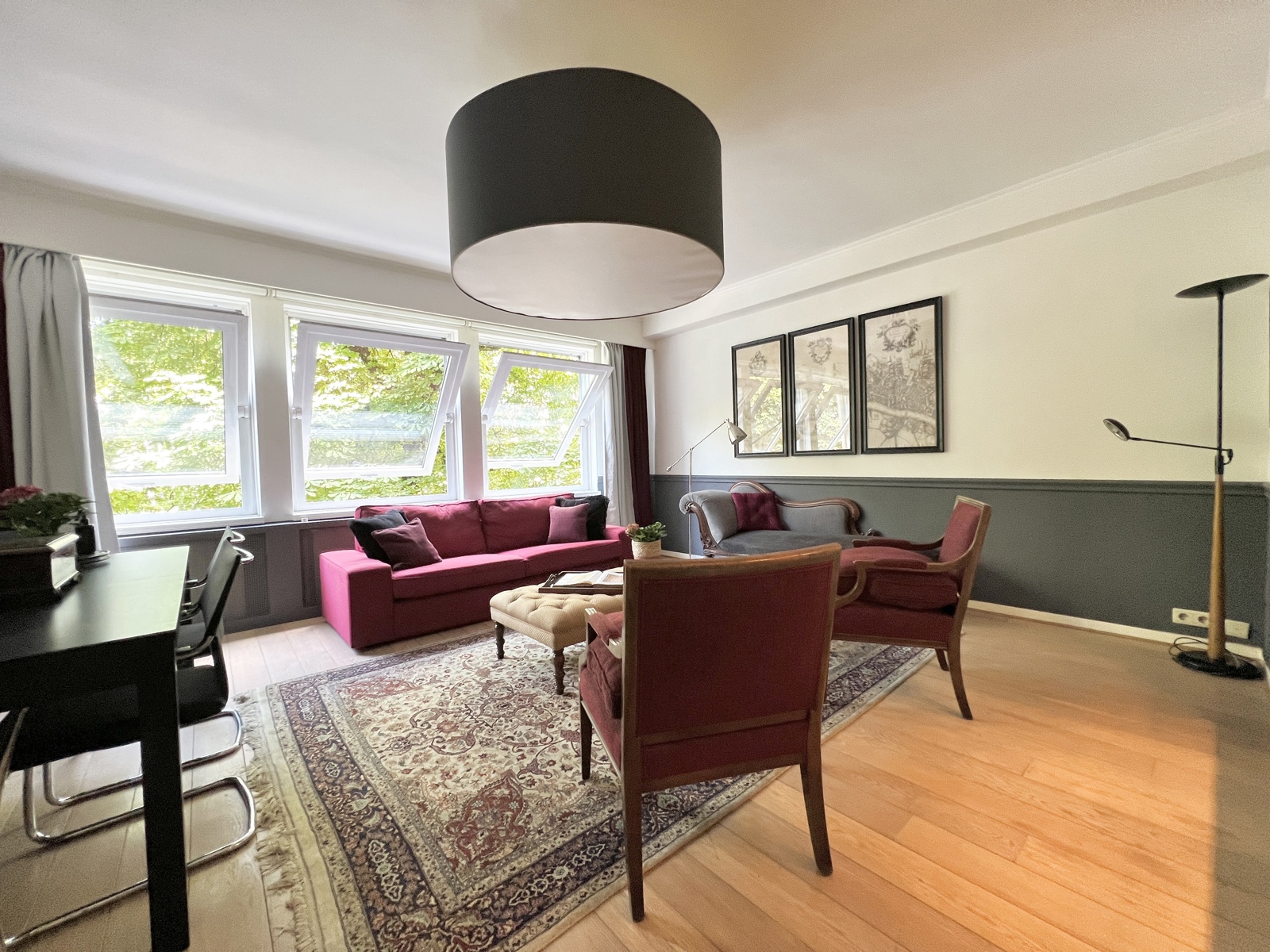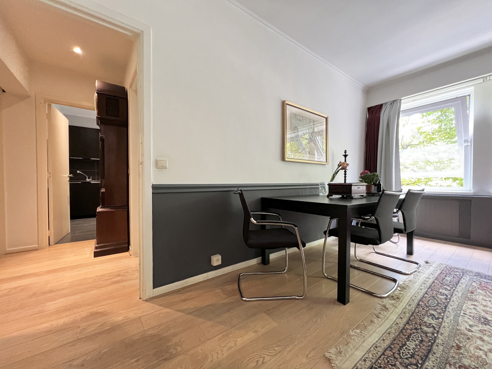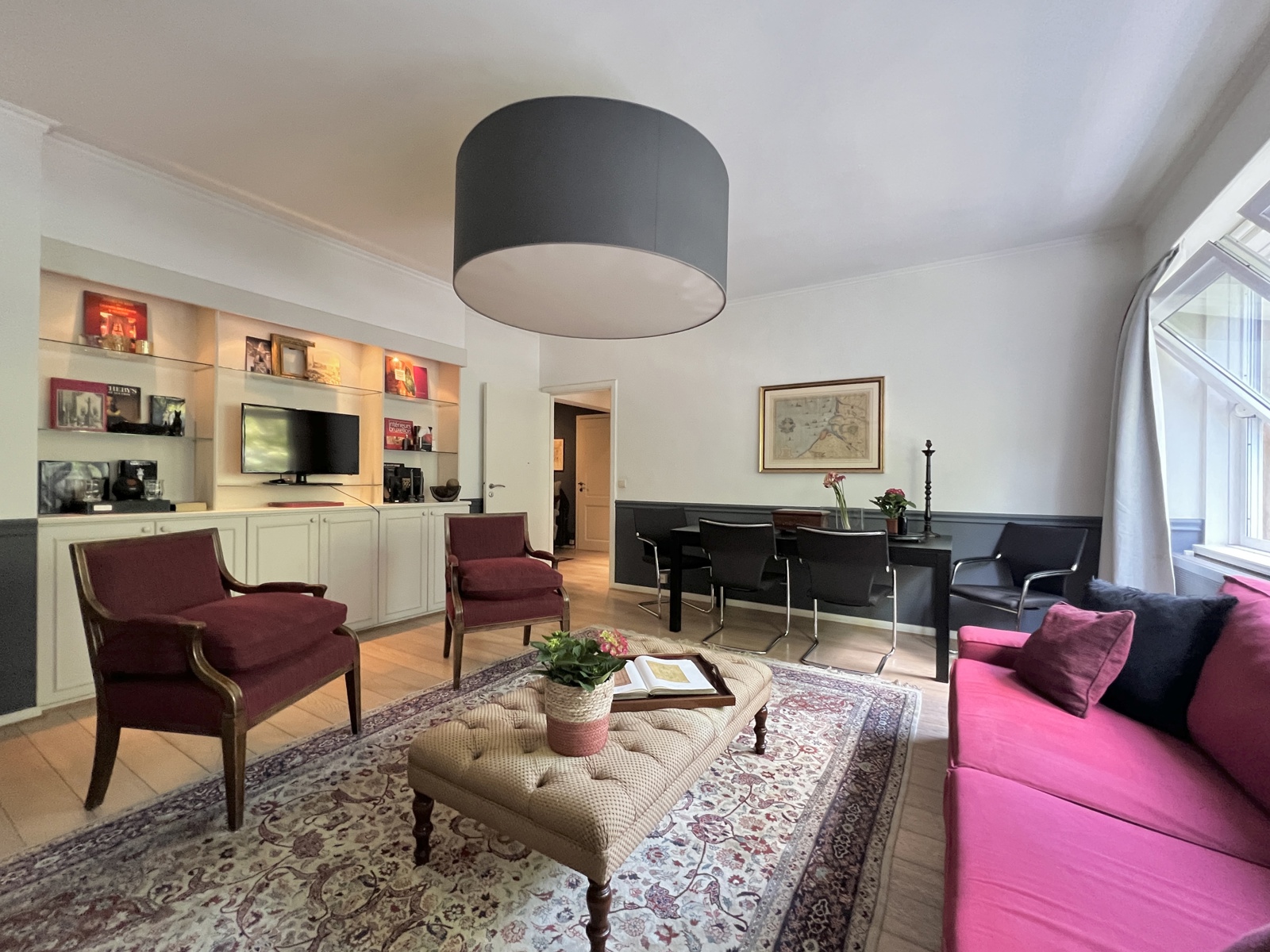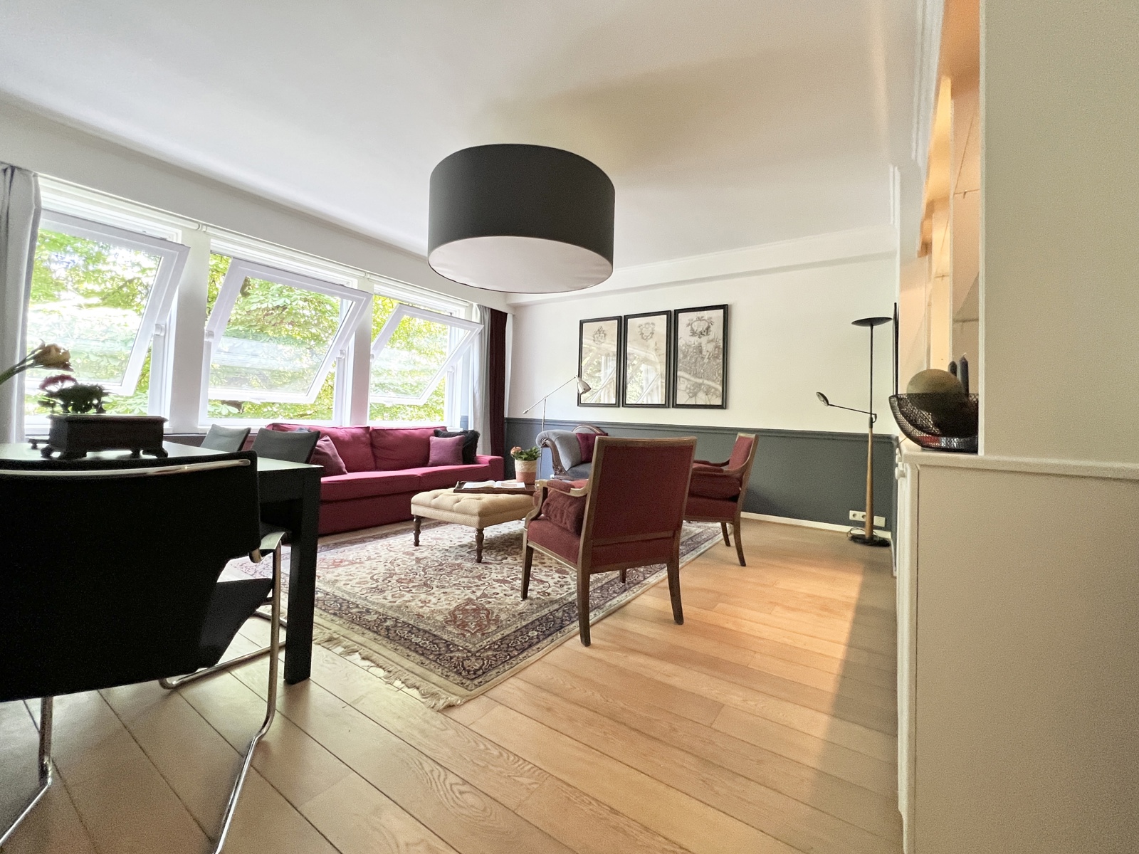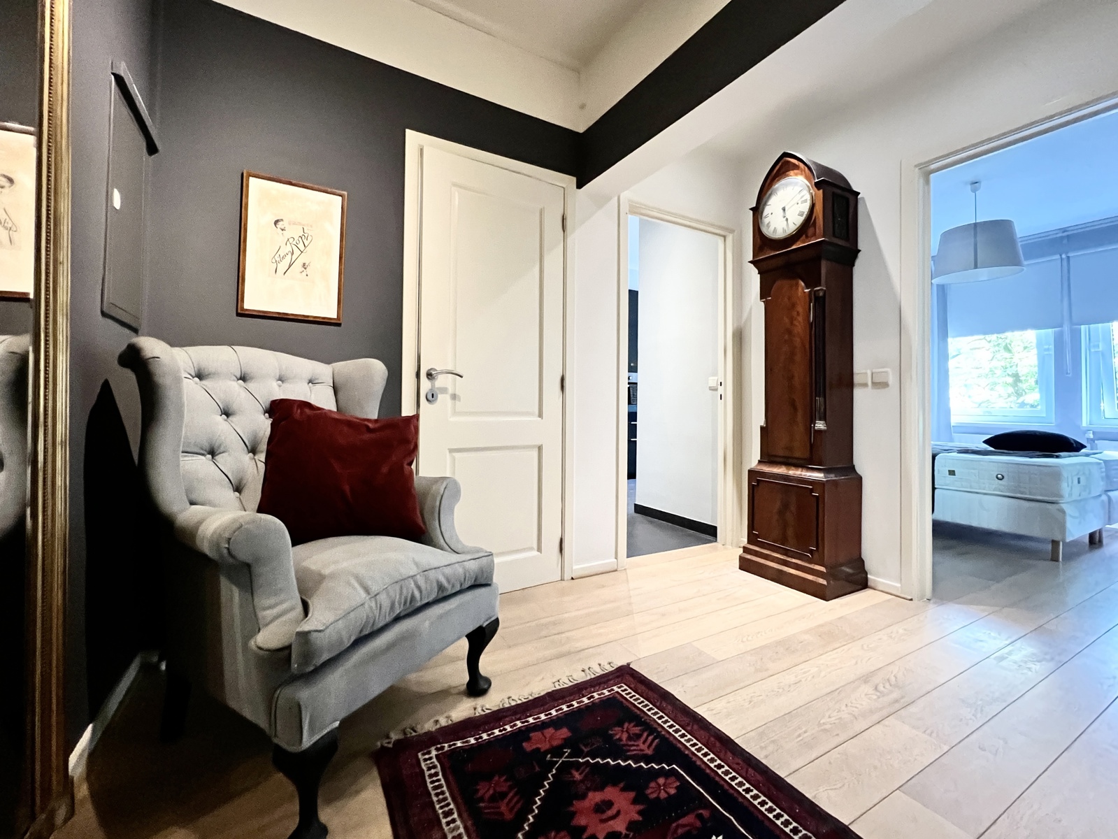 L’appartement se compose comme suit : Un hall d’entrée avec vestiaire. Un lumineux séjour de ±26 m² avec parquet au sol, comprenant salon et salle à manger