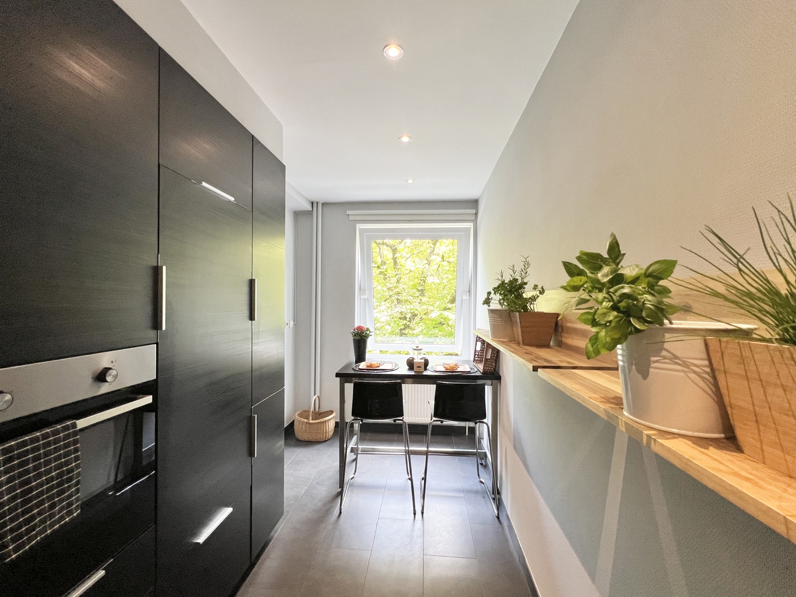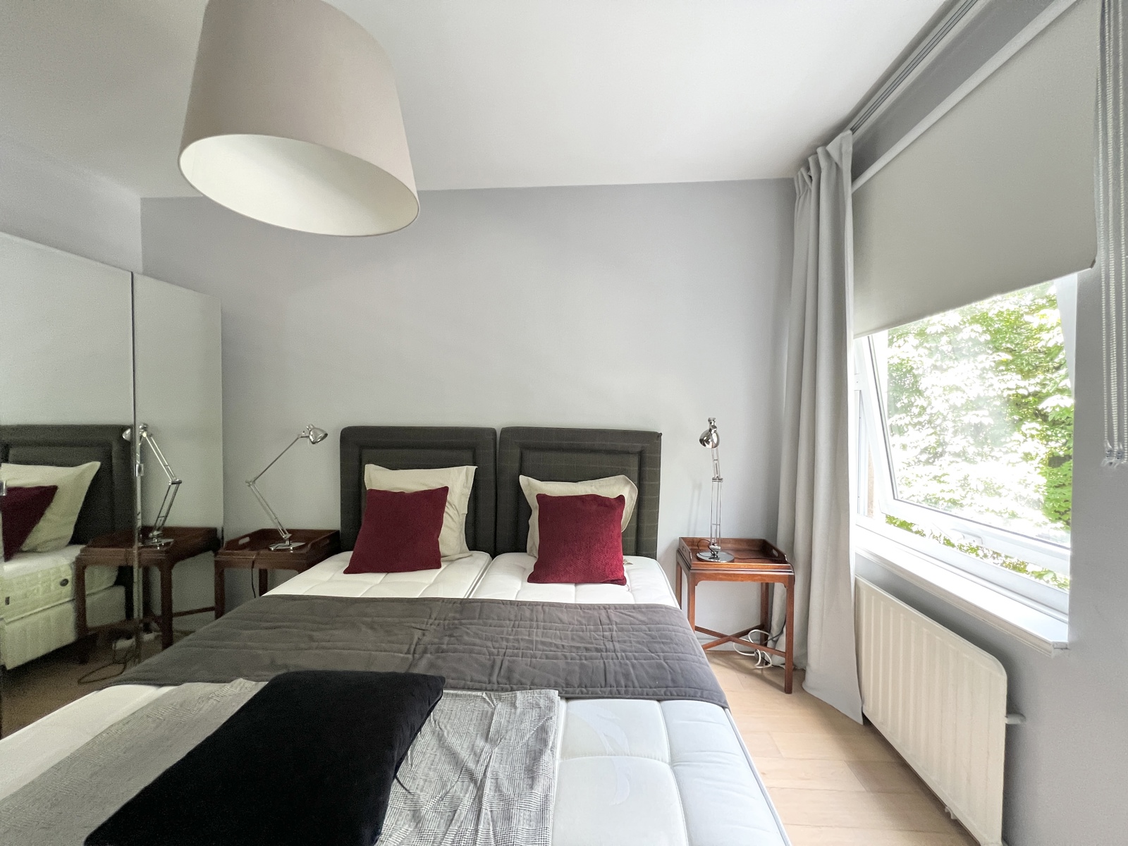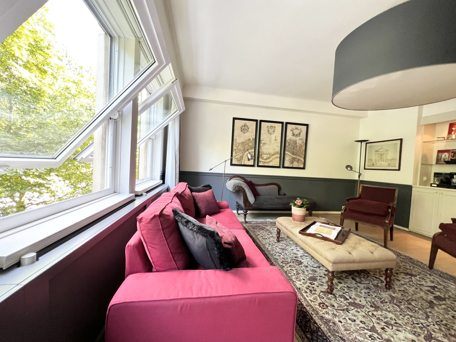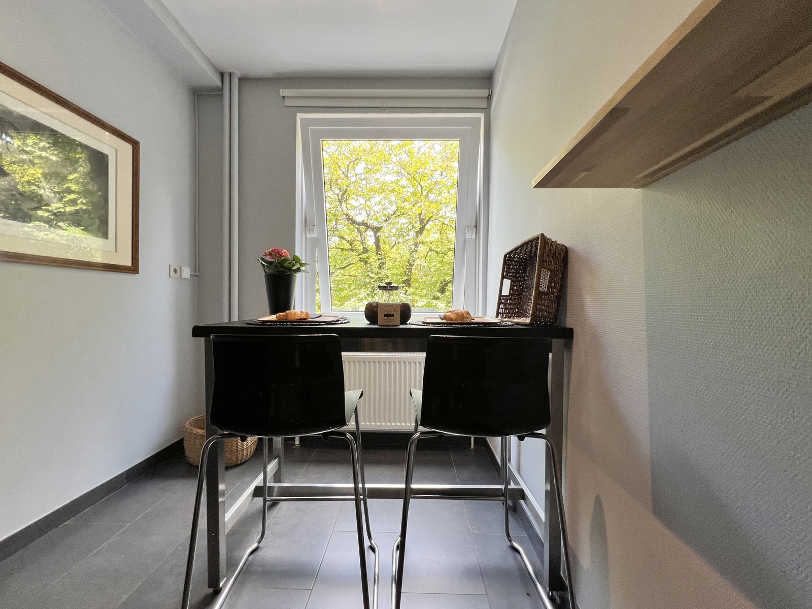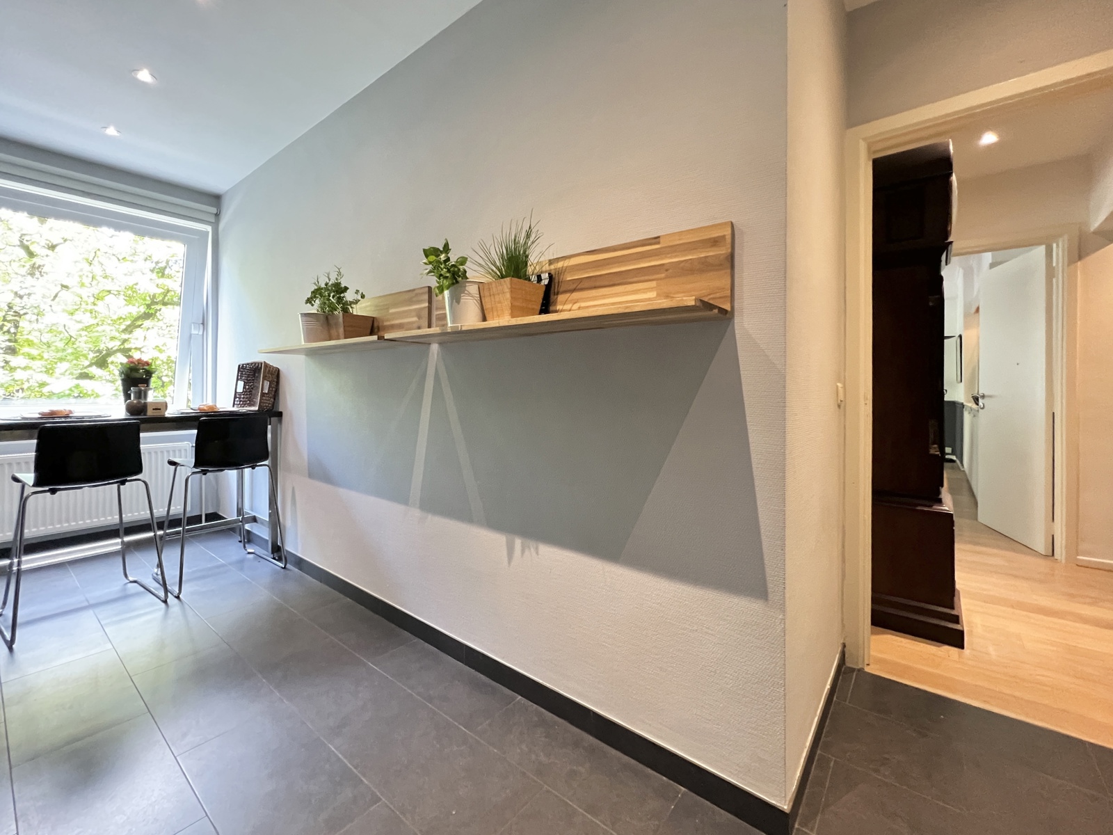 L’appartement se compose comme suit : Un hall d’entrée avec vestiaire. Un lumineux séjour de ±26 m² avec parquet au sol, comprenant salon et salle à manger