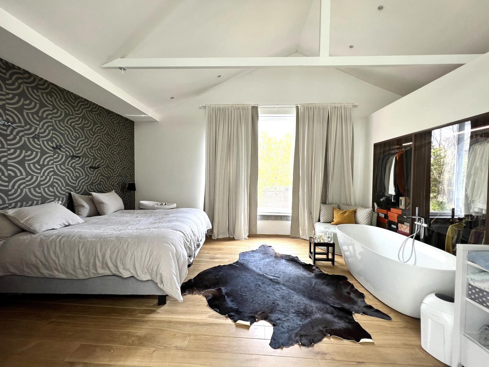 La master bedroom avec baignoire sur pied de +/- 23m², dressing sur mesure de +/- 9m².