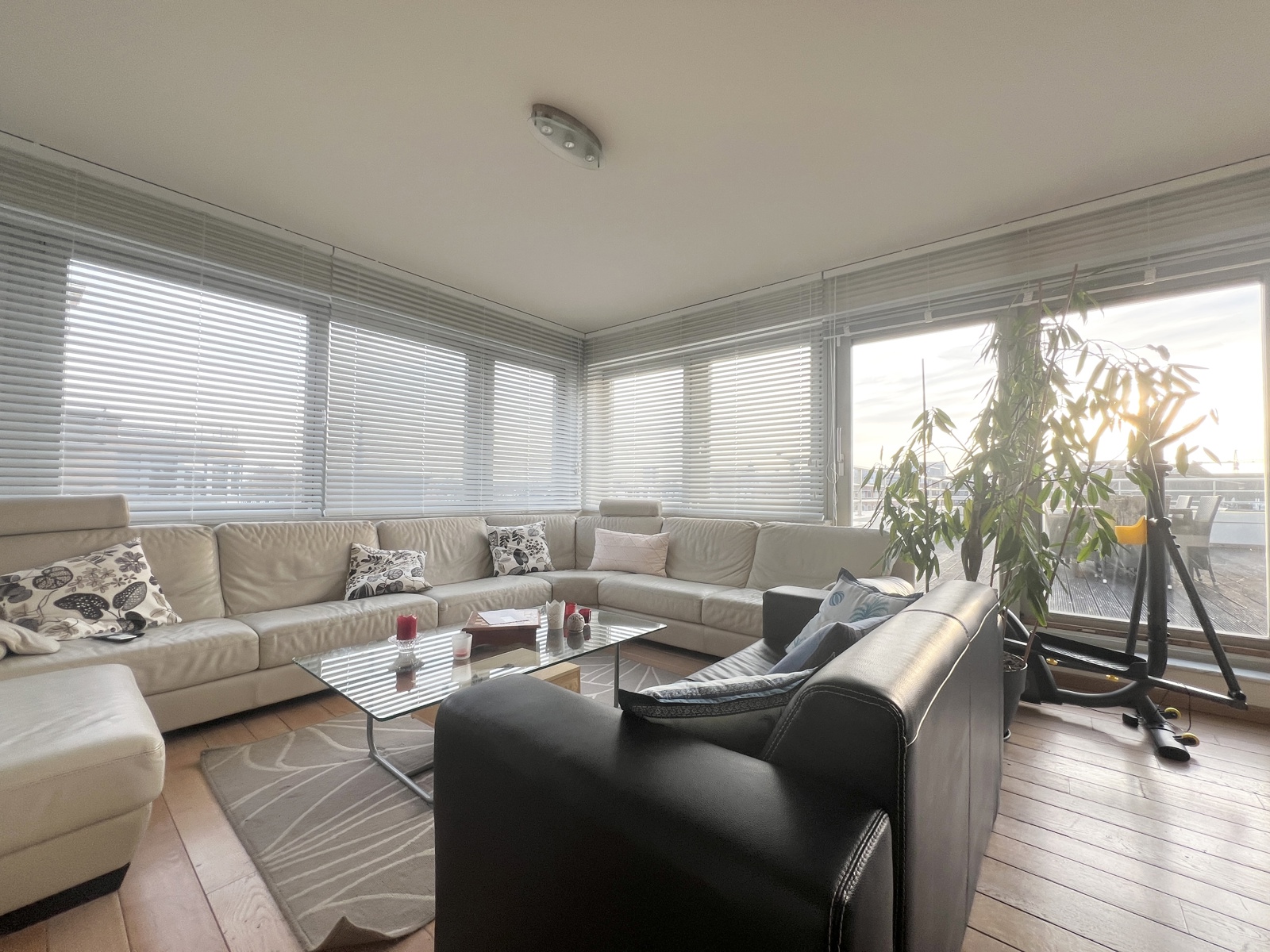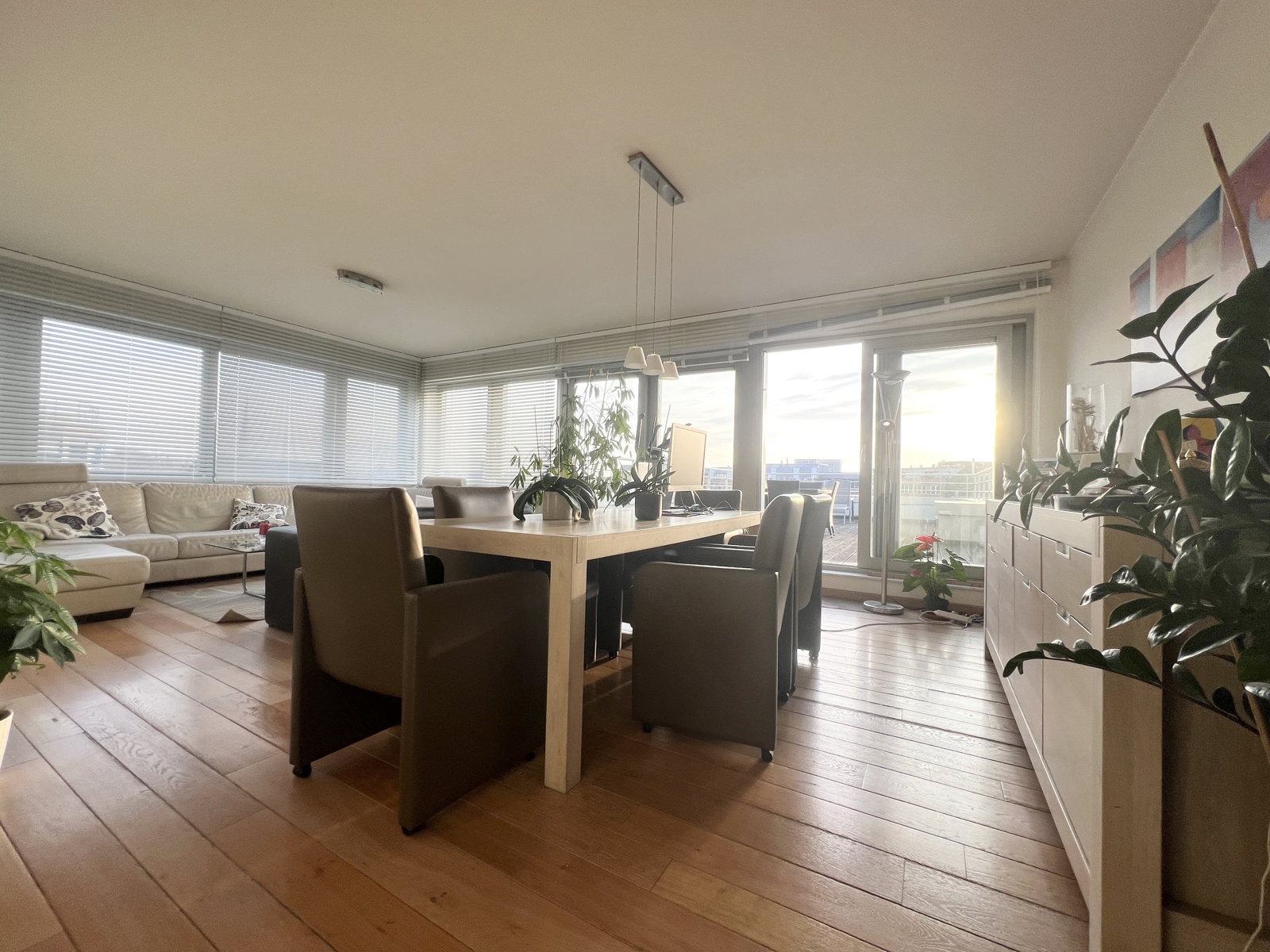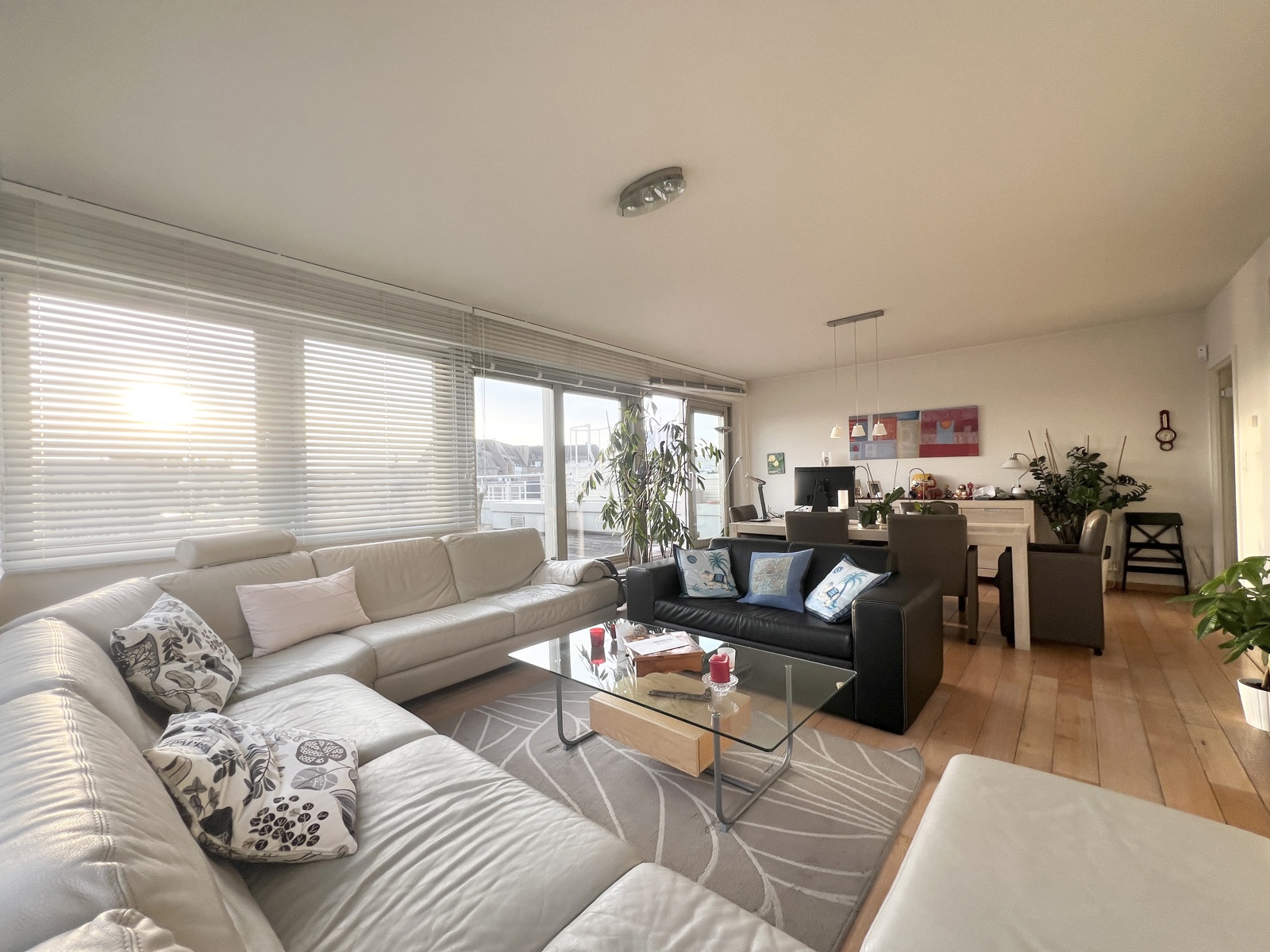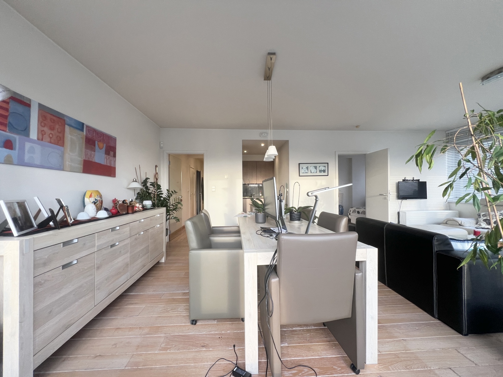 Le salon et la salle à manger s'ouvrent sur une cuisine super équipée, offrant un accès à la magnifique terrasses de 43m² plein sud offrant une vue dégagée sur les parcs environnants.